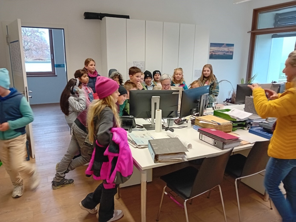 Im Bauamt ließ Frau Eckert die ganze Klasse auf ihren großen Bildschirm schauen. Sie erkläre Luftbilder und zeigte den Kindern unsere Schule von oben.