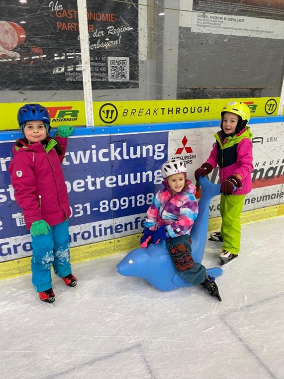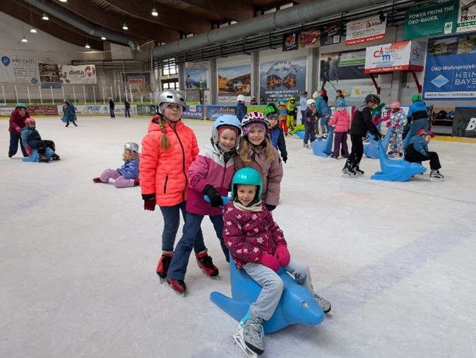 Am Montag, den 9. Februar fuhr die ganze Schule in die Eishalle nach Bad Aibling zum Schlittschuh laufen. Mit an Bord waren 10 Mamas und Papas, die uns nicht nur beim Schuhe binden unterstützten, sondern auch auf dem Eis. Besonders unsere „Anfänger auf Kufen“ benötigten eine zusätzliche Hand zum Festhalten oder Aufhelfen nach einem Sturz. Unseren Begleitern gilt deshalb unser besonderer Dank. Denn ohne sie wäre so ein sportliches Event nicht denkbar.