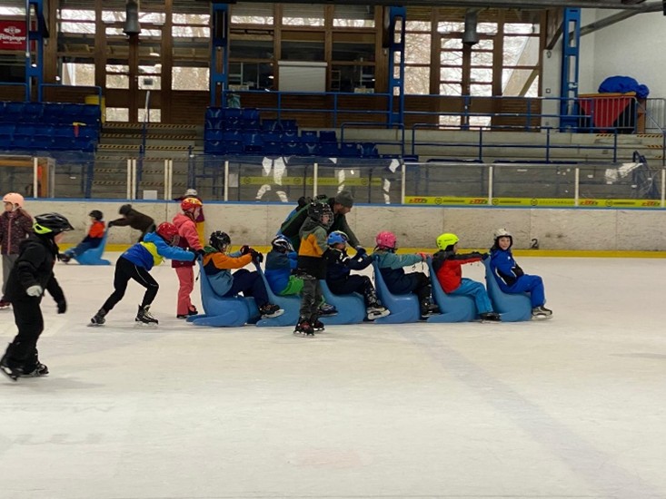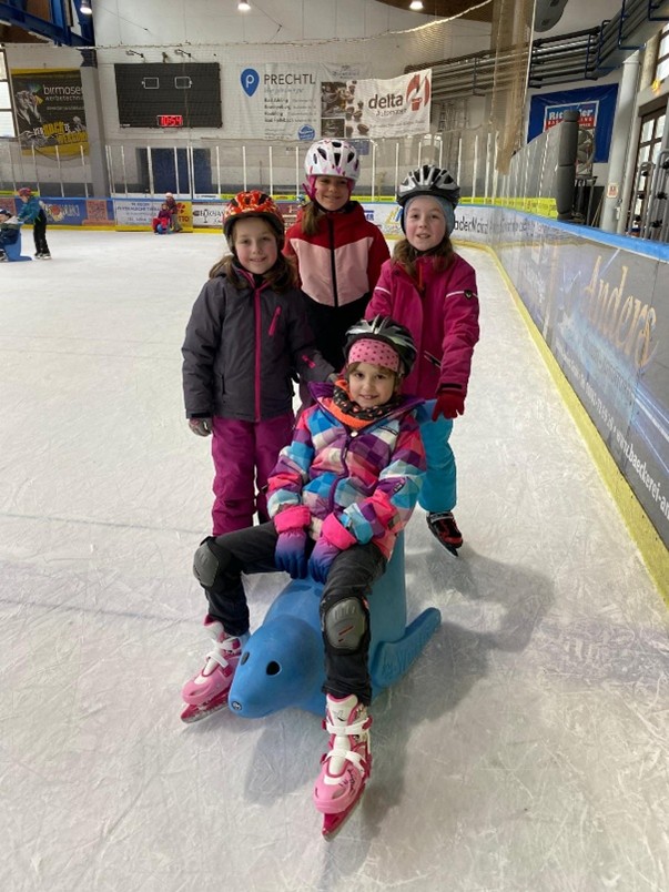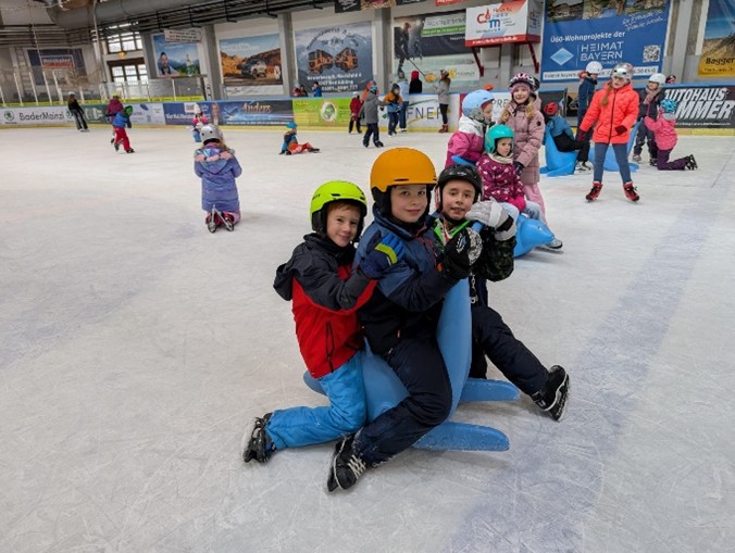 Am Montag, den 9. Februar fuhr die ganze Schule in die Eishalle nach Bad Aibling zum Schlittschuh laufen. Mit an Bord waren 10 Mamas und Papas, die uns nicht nur beim Schuhe binden unterstützten, sondern auch auf dem Eis. Besonders unsere „Anfänger auf Kufen“ benötigten eine zusätzliche Hand zum Festhalten oder Aufhelfen nach einem Sturz. Unseren Begleitern gilt deshalb unser besonderer Dank. Denn ohne sie wäre so ein sportliches Event nicht denkbar.