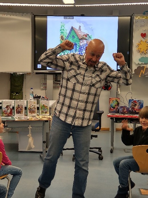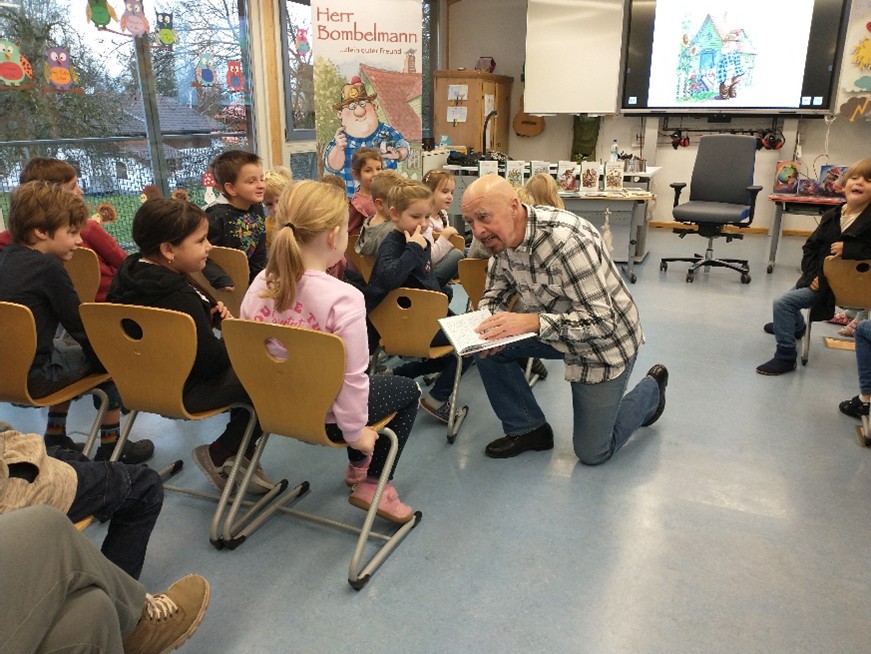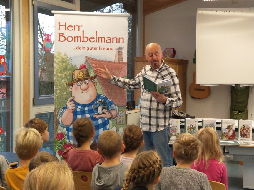 Er stellte uns seine Kinderbuch-Reihe „Herr Bombelmann“ vor, die bereits sieben Bücher umfasst. Für seinen Vortrag hatte er sich eine Geschichte herausgesucht, in der Herr Bombelmann einem Maulwurf begegnet, der gerne sehen möchte. Herr Bombelmann begleitet ihn zum Augenarzt, wo das kleine Tier eine Brille bekommt. Äußerst lebendig und ausdrucksstark las der Autor aus seinem Buch vor und zog so das Publikum völlig in seinen Bann.