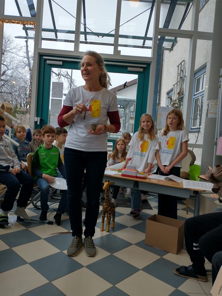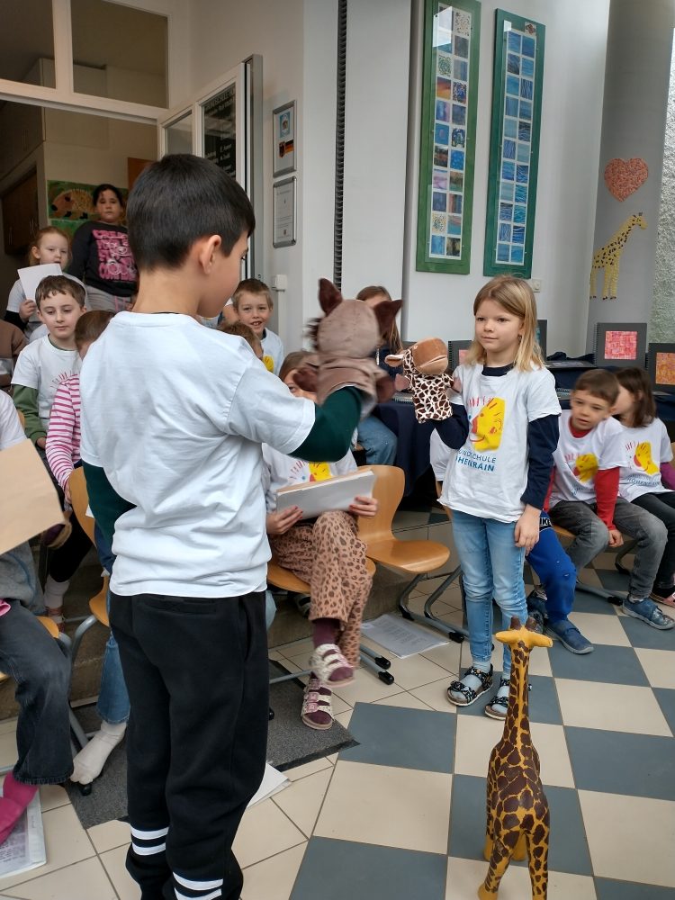 Thematisch dazu passte natürlich auch die sogenannte Giraffensprache, die seit Jahren an unserer Schule praktiziert wird. In einem kleinen Dialog zwischen einem genervten Wolf und der stets den Überblick behaltenden, friedliebenden Giraffe demonstrierte die zweite Klasse, wie man miteinander sprechen sollte, ohne den anderen verbal zu verletzen.