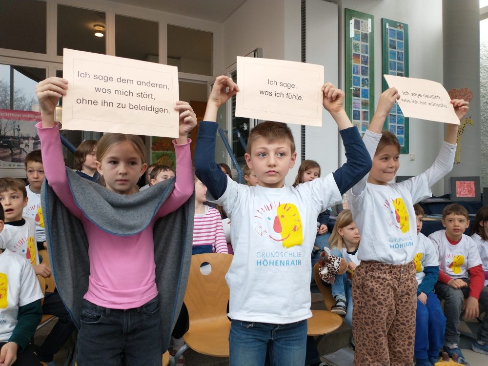 Am Ende verteilte Frau Pustka an jede Klasse drei Sprechblasen. Auf diesen sollte bei der Nachbesprechung im Unterricht noch einmal alle Zauberworte gesammelt werden, die den Kindern wichtig sind. Im Schulhaus verteilt und aufgehängt erinnern sie nun an unsere Schulversammlung, denn Zauberworte dürfen keine leeren Worte sein.