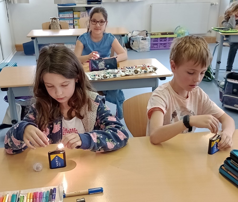 Die Leitfähigkeit verschiedener Stoffe wurde anhand zahlreicher Versuche aufgezeigt und obwohl auch im Unterricht schon ähnliche Experimente durchgeführt wurden, war es doch immer wieder spannend, das Lämpchen aufleuchten zu sehen, wenn der Stromkreis mit einem leitfähigen Material geschlossen wurde.