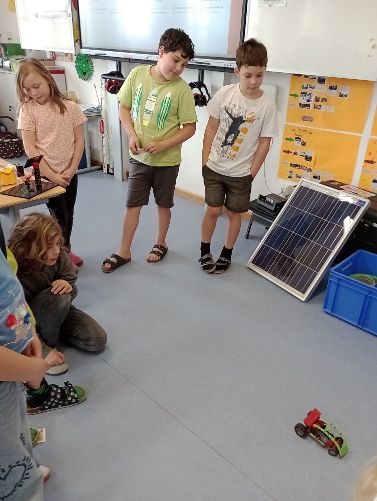 Ein weiteres Highlight neben diesem Mini-Elektro-Bausatz war das Lego-Elektro-Auto, das an der Solartankstelle aufgetankt wurde und ein paar Runden im Klassenzimmer drehen konnte.