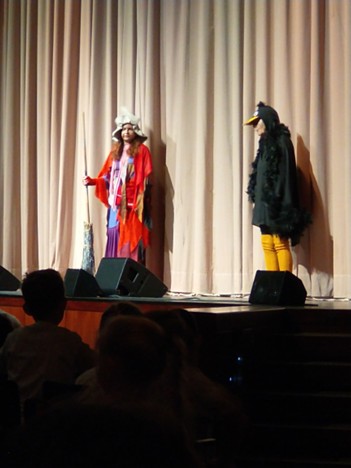 Ein großes Hallo gab es nach der Vorstellung, als die Schauspieler sich in der Aula zum Spalier aufstellten, um sich persönlich von ihrem Publikum zu verabschieden. Der Rabe Abraxas machte sogar ein Foto mit unserer 1. Klasse.